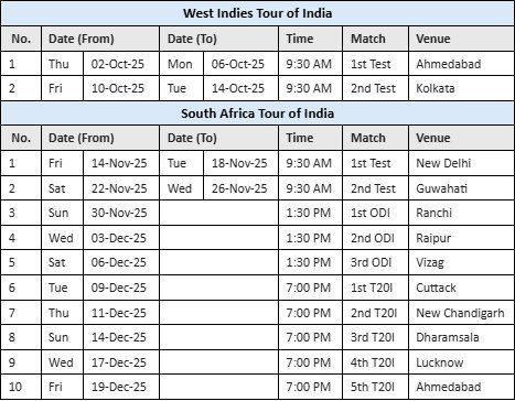 The home season will commence with the IDFC First Bank Test series against West Indies, starting on 2nd October 2025 in Ahmedabad. The second and final Test of the series will be held in Kolkata from 10th October.
