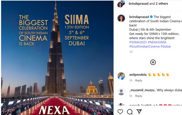 Brinda Prasad, Chairperson of SIIMA, shared the exciting news through her Instagram handle by posting a promotional poster, confirming the return of SIIMA to Dubai. She wrote, "The biggest celebration of South Indian Cinema is back! Dubai | 5th & 6th September. Get ready for SIIMA’s 13th edition, where stars shine the brightest!"