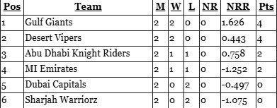 The Warriorz started the second innings with a spring in their step. Johnson Charles (15 off 13) hit three fours, but Naveen-ul-Haq got the early breakthrough, and Shubham Ranjane (6 off 7) followed soon after, shifting momentum in MI Emirates’ favour. Tim David (13 off 7) hit Fazalhaq Farooqi for three consecutive fours but the Afghan bowler had the last laugh, rattling his stumps to reduce the Warriorz to 48/3 at the end of the powerplay.