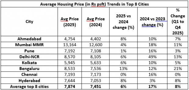 National, February 05, 2026: The average housing price growth slowed to 6% in 2025 across top 8 cities in India, a significant dip from 17% growth recorded in 2024, according to a report by PropTiger.com.