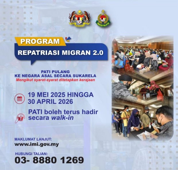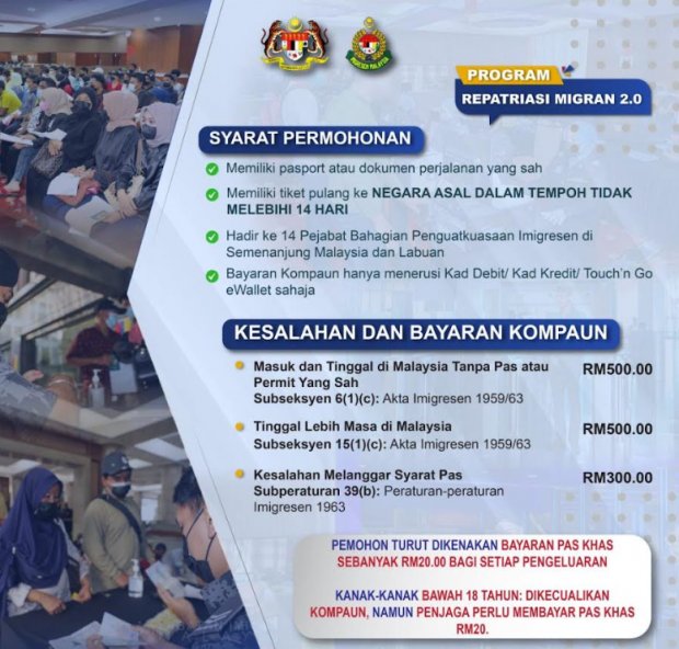 కౌలాలంపూర్: ఉపాధి కోసం వెళ్లి అక్కడ అనివార్యమైన పరిస్థితుల్లో ఇబందుల్లో చిక్కుకొని స్వదేశానికి రాలేని అక్రమ వలసదారులకు మలేషియా ప్రభుత్వం మైగ్రంట్ రేపట్రియేషన్ ప్రోగ్రాం ఆమ్నెస్టీ (క్షమాభిక్ష) ప్రకటించింది.అది ఇప్పుడు వచ్చే నెల ఏప్రిల్ 30, 2026 కి ముగుస్తుంది.ఈ గడువు లోపు పాస్పోర్ట్ లేకుండా వున్నవాళ్లు,వర్క్ పర్మిట్ వీసాల గడువు ముగిసినవారు మలేషియా వదిలి వెళ్ళినట్లయితే వారు ఎటువంటి చట్టపరమైన ఇబ్బందులు లేకుండా భారత్కు వెళ్ళవచ్చు.
