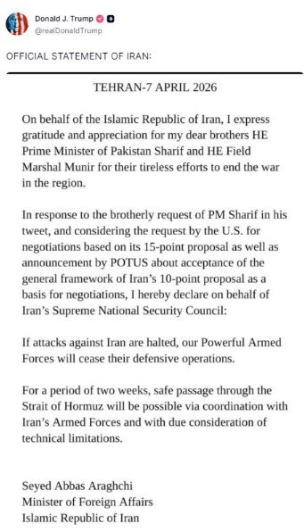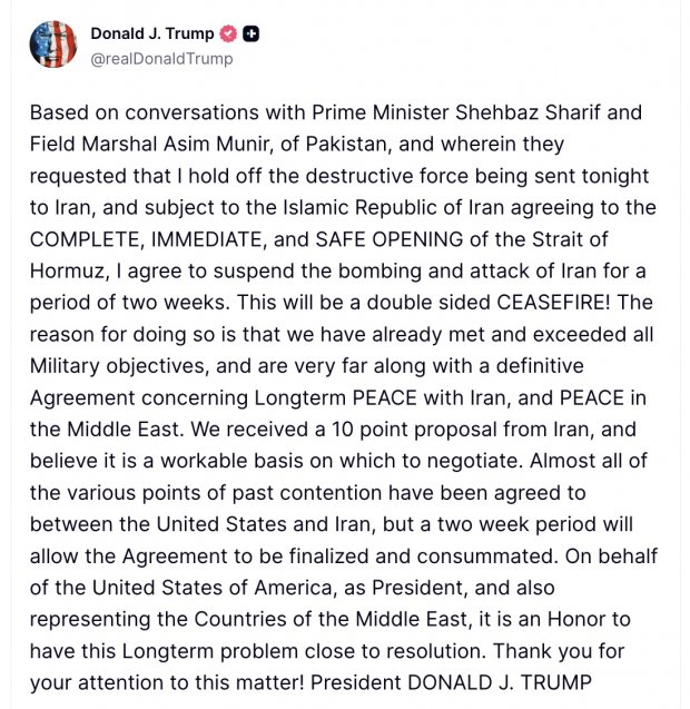 ట్రంప్ సోషల్ ట్రూత్లో పోస్టు ప్రకారం.. పాకిస్థాన్ ప్రధాని షరీఫ్, ఫీల్డ్ మార్షల్ ఆసిమ్ మునీర్తో మాట్లాడాను. ఇరాన్కు ఇచ్చిన గడువును రెండు వారాలపాటు పొడిగించాలని, దాడులను నిలిపివేయాలని కోరారు. హర్మూజ్ జలసంధిని తెరవాలనే షరతుకు లోబడి రెండు వారాల గడువు ఇచ్చేందుకు, కాల్పుల విరమణకు అంగీకరించాను. ఇరుదేశాల వైపు నుంచి ఈ కాల్పుల విరమణ ఉంటుంది. ఇరాన్ పది సూత్రాలతో ఒక ప్రతిపాదనను పంపించింది. అవన్నీ సానుకూలంగానే ఉన్నాయి. దీంతో చర్చలు కీలక దశకు చేరుకున్నాయి. ఇరాన్తో శాశ్వత శాంతి ఒప్పందానికి పశ్చిమాసియాలో శాంతిని నెలకొల్పడానికి ఈ రెండు వారాల గడువు ఉపయోగపడుతుందని ట్రంప్ పేర్కొన్నారు.