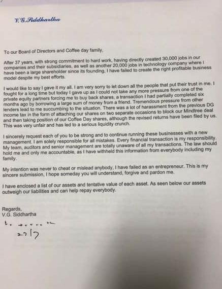 'కేఫ్ కాఫీ డే' వ్యవస్థాపకుడు వి.జి సిద్ధార్థ అదృశ్యం