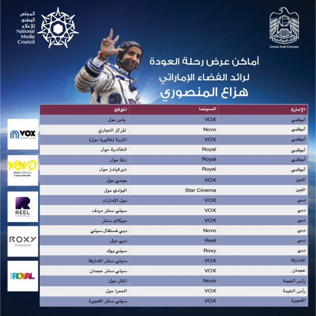 మొదటి ఎమిరాటి మరియు అరబ్ వ్యోమగామి అయినందుకు తన చారిత్రాత్మక ప్రయాణాన్ని యూఏఈ లో పలు సినిమాహాళ్ళలో ప్రత్యక్ష ప్రసారం 1.30 PM - 3 PM (UAE time) ప్రసారం చేయబడుతుంది. ఈ అవకాశాన్ని నేషనల్ సినిమా కౌన్సిల్ కల్పిస్తోంది.