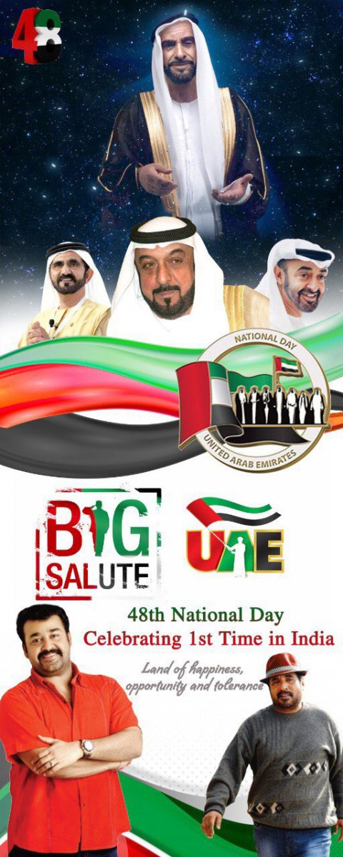 పద్మ భూషణ్ గ్రహీత, ప్రముఖ సినీ నటుడు మోహన్ లాల్ తన అద్భుత నటనతో ఎందరో హృదయాలను గెల్చుకొని 300 పైగా చిత్రాల్లో నటించారు. ఆయనకు యూఏఈ తో మంచి వాణిజ్య సంబంధాలు కూడా ఉన్నాయ్. యూఏఈ యొక్క 48వ నేషనల్ డే మరియు 'Year of Tolerance' ను పురస్కరించుకొని 'Big Salute to UAE: the Land of Happiness, Opportunity and Tolerance' పేరున ఈవెంట్ ను డిసెంబర్ 2న తమిళనాడు లోని కోయింబతూర్ లో నిర్వహించనున్నారు. ఈ వేడుక యూఏఈ పై మాకు గల అభిమానం ను తెలియజేసే ఒక ప్రయత్నం అని మోహన్ లాల్ అన్నారు.