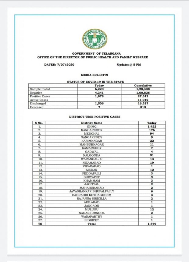 హైదరాబాద్: తెలంగాణలో గడిచిన గంటల్లో 1,879 పాజిటివ్ కేసులు నమోదు కాగా ఏడుగురు మృతి చెందారు. ఇప్పటివరకూ అన్ని జిల్లాల్లో 27,612 మందికి కరోనా పాజిటివ్ వచ్చింది. మొత్తం 313 మంది కరోనా సోకి చనిపోయారు. ఇంకా 11,012 కేసులు యాక్టివ్గా ఉన్నాయి.తాజాగా 1,506 మంది డిశ్చార్జి కాగా ఇప్పటివరకూ 16,287 మంది డిశ్చార్జి అయ్యారు.