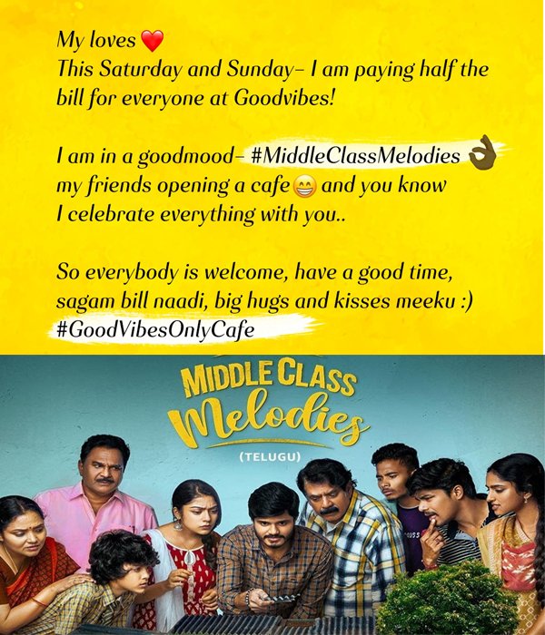 ఈ వీకెండ్ "గుడ్ వైబ్స్ ఓన్లీ" కేఫ్ కు వచ్చే మీ కోసం సగం బిల్ నేను చెల్లిస్తాను. సో మీ అందరికీ వెల్ కమ్. బిల్ నాది" అని ట్వీట్ చేశారు.