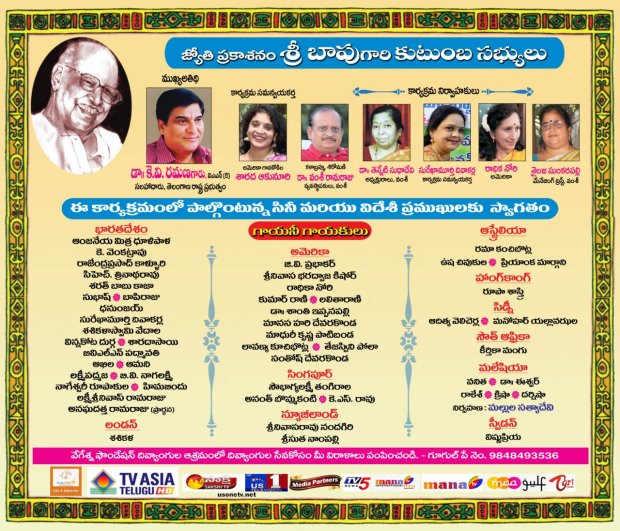 3వ ప్రపంచ సంగీత, సాహిత్య సమ్మేళనం సందర్భంగా పద్మశ్రీ పురస్కారగ్రహీత ప్రముఖ చిత్రకారులు, ప్రముఖ సినీదర్శకులు, రచయిత బాపు 87వ జయంతిని వంశీ ఇంటర్నేషనల్‌ ఇండియా, వేగేశ్న ఫౌండేషన్‌ ఇండియా, అమెరికా సంయుక్త ఆధ్వర్యంలో డిసెంబర్‌ 20వ తేదీ ఉదయం 10 గంటలనుంచి రాత్రి 10 గంటల వరకు అంటే నిర్విరామంగా 12 గంటలపాటు నిర్వహించనున్నారు. 5 ఖండాలలోని 10 దేశాలలోని 50మంది గాయనీ గాయకులు బాపు దర్శకత్వం వహించిన చిత్రాలనుంచి 130 ఆణిముత్యాలవంటి పాటలతో బాపు పాటకు పట్టాభిషేకం చేయనున్నారు. భారతదేశం నుంచి మిత్ర, కె. వెంకట్రావు, రాజేంద్రప్రసాద్‌, సిహెచ్‌. త్రినాథరావు, శరత్‌బాబు కాజా, సుభాష్‌, బాపిరాజు, ధనంజయ్‌, సురేఖామూర్తి దివాకర్ల, శశికళాస్వామి వేదాల, విన్నకోట దుర్గ, శారదా సాయి, బి.వి.ఎల్‌.ఎన్‌ పద్మావతి, అఖిల, ఆమని, చిత్తరువు లక్ష్మీపద్మజ, బి.వి. నాగలక్ష్మి, నాగేశ్వరి రూపాకుల, హిమబిందు, లక్ష్మీ శ్రీనివాస్‌ రామరాజు, అనఘదత్త రామరాజు తమ గానం వినిపిస్తారు. అలాగే అమెరికా నుంచి జి.వి. ప్రభాకర్‌, శ్రీనివాస భరద్వాజ కిశోర్‌, రాధికానోరి, కుమార్‌ రాణి, లలితారాణి, డా.శాంతి ఇప్పనపల్లి, మాధురీ కృష్ణ పాటిబండ, లావణ్య కూచిభొట్ల, మానస హరి దేవరకొండ, సంతోష్‌ దేవరకొండ, తేజస్విని పోలా; సింగపూర్‌ నుంచి సౌభాగ్యలక్ష్మి తంగిరాల, అనంత్‌ బొమ్మకంటి, కె.ఎస్‌. రావు; న్యూజీలాండ్‌ నుంచి శ్రీనివాసరావు నందగిరి, శ్రీసుత నాంపల్లి; ఆస్ట్రేలియా నుంచి రమా కంచిభొట్ట, ఉష చివుకుల, ప్రియాంక మార్గాని; హాంగ్‌కాంగ్‌ నుంచి రూపాశాస్త్రి; సిడ్నీ నుంచి ఆదిత్య వెనిచెర్ల, మనోహర్‌ యల్లావఝల; సౌత్‌ ఆఫ్రికా నుంచి కీర్తికా మంగు; మలేషియా నుంచి వనిత, డా.ఈశ్వర్‌, రాకేష్‌, క్రిషా, దర్నీషా; స్వీడన్‌ నుంచి విష్ణుప్రియ; లండన్‌ నుంచి శశికళ తమ గానం వినిపిస్తారని కార్యక్రమ సమన్వయకర్తలు అమెరికా గానకోకిల శారద ఆకునూరి, డా.వంశీ రామరాజు తెలియజేశారు.