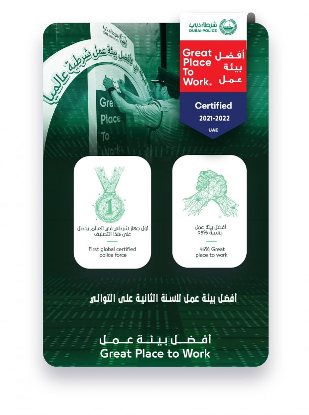 The Dubai Police General Command obtained the accreditation certificate as the best work environment for the second conductive year after it won it in 2019, as in 2019 Dubai Police was considered the first police and government agency to obtain accreditation at the local and global levels.