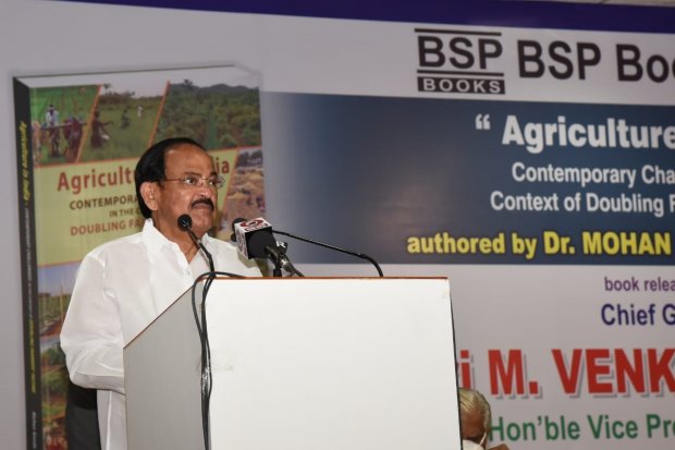 ఆంధ్రప్రదేశ్ ప్రభుత్వ మాజీ ప్రధాన కార్యదర్శి డాక్టర్ మోహన్ కందా రచించిన ‘అగ్రికల్చర్ ఇన్ ఇండియా: కాంటెంపరరీ చాలెంజెస్-ఇన్ ద కాంటెక్స్ట్ ఆఫ్ డబ్లింగ్ ఫార్మర్స్ ఇన్కమ్’ పుస్తకాన్ని హైదరాబాద్లో ఉపరాష్ట్రపతి ఆవిష్కరించారు. ఈ సందర్భంగా ఆయన మాట్లాడుతూ.. పలు సమస్యల కారణంగా రైతులు తమ పూర్తిస్థాయి సామర్థ్యాన్ని ప్రదర్శించలేకపోతున్నారని, ఈ సమస్యలను ఇలాగే కొనసాగించడం సరికాదని ఆయన సూచించారు.
