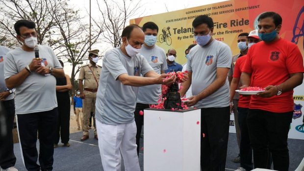 హైదరాబాద్: తెలంగాణ రాష్ట్ర డిసాస్టర్ రెస్పాన్స్ మరియు ఫైర్ సర్వీసెస్ డిపార్ట్మెంట్ సేవలు త్యాగ పూరితమైనవని రాష్ట్ర హోం శాఖ మంత్రి మహ్మద్ మహమూద్ అలీ అన్నారు. హైదరాబాద్ లోని నెక్లెస్ రోడ్డులోని పీపుల్స్ ప్లాజా వద్ద ఆదివారం నాడు ఫైర్ సర్వీసెస్ శాఖ ఆధ్వర్యంలో "తెలంగాణ ఫైర్ రైడ్ 2021 " జరిగింది. సంజయ్ కుమార్ జైన్, డైరెక్టర్ జనరల్ ఫైర్ సర్వీసెస్, లక్ష్మి ప్రసాద్, డైరెక్టర్, నారాయణ్ రావు, అడిషనల్ డెరైక్టర్, పాపయ్య, ఆర్ ఎఫ్ ఓ తదితరులు కార్యక్రమంలో పాల్గొన్నారు.ఈ సందర్భంగా హోం మంత్రి మాట్లాడుతూ....ఎన్నో అగ్ని ప్రమాదాల నుండి ఈ శాఖలో పని చేస్తున్న సిబ్బంది సామాన్య ప్రజల ప్రాణాలను, ఆస్తులను కాపాడారని హోం మంత్రి ప్రశంసించారు.అగ్నిమాపక సేవలందిస్తున్న ఈ శాఖ పలు అవగాహన కార్యక్రమాలు నిర్వహించిందని, అగ్ని మాపక వారోత్సవాల సందర్భంగా సైకిల్తన్ నిర్వహించడం అభినందనీయమన్నారు.ఏప్రిల్ 14, 1944 న గ్రేట్ బ్రిటన్ నేవీ యొక్క యుద్ధనౌకలో బొంబాయి నౌకాశ్రయంలో మంటలు చెలరేగడంతో, 66 మంది అధికారులు మరియు అగ్నిమాపక సిబ్బంది మరణించారని, వారి జ్ఞాపకార్థం ప్రతి సంవత్సరం ఏప్రిల్ 14 న అగ్నిమాపక సేవల దినోత్సవాన్ని జరుపు కుంటున్నామని గుర్తుచేశారు.ఈ వారోత్సవాలు ఏప్రిల్ 14 న ప్రారంభమై ఏప్రిల్ 20 వరకు కొనసాగుతున్నయని తెలియజేశారు. వారోత్సవాలలో వివిధ కార్యక్రమాలు నిర్వహిస్తున్నామని చెప్పారు. అగ్నిమాపక సేవల వారోత్సవాలు సాధారణ ప్రజలలో భద్రత గురించి అవగాహన పెంచుతాయన్నారు. స్నేహపూర్వక వాతావరణాన్ని పెంపొందించడం ద్వారా అతిపెద్ద సమస్యలను పరిష్కరించడానికి వీలుగా ప్రజలు అగ్నిమాపక సేవల సర్వీసెస్ తో మంచి సంబంధాలు పెట్టుకోవడం చాలా ముఖ్యం అని హోంమంత్రి అన్నారు.ముఖ్యమంత్రి కల్వకుంట్ల చంద్ర శేఖర్ రావు నాయకత్వంలో తెలంగాణ రాష్ట్రం సమగ్ర అభివృద్ధి కోసం కృషి చేస్తుందన్నారు. తెలంగాణ ఏర్పడటానికి ముందు రాష్ట్రంలో కేవలం 97 అగ్నిమాపక కేంద్రాలు మాత్రమే ఉన్నాయి.తెలంగాణ ఏర్పడినప్పటి నుంచి తక్కువ వ్యవధిలో 20 కి పైగా అగ్నిమాపక కేంద్రాలకు తెలంగాణ ప్రభుత్వం అనుమతి ఇచ్చిందని ఆయన చెప్పారు.తెలంగాణ ప్రభుత్వం అగ్నిమాపక సేవల విభాగం యొక్క శిక్షణా సౌకర్యాలను మెరుగుపరిచి, ఆధునీకరించిందని చెప్పారు. అన్ని అగ్నిమాపక కేంద్రాలకు కొత్త ఫైర్ మోటార్సైకిళ్లను అందించారని తెలిపారు.ఈ వాహనాల సహాయంతో ప్రమాద స్థలాన్ని వెంటనే చేరుకొని ప్రమాదాలను నివారించవచ్చని వివరించారు.ఈ కార్యక్రమంలో శాఖా సిబ్బంది, తదితరులు పాల్గొన్నారు.
