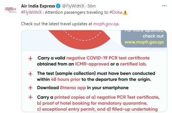 దోహా: భారత్ కు చెందిన ఎయిరిండియా ఎక్స్ప్రెస్ భారత్ నుండి ఖతార్ వెళ్లే ప్రయాణికులకు కొత్త ప్రయాణ మార్గదర్శకాలు విడుదల చేసింది. ప్రయాణికులు తప్పనిసరిగా పీసీఆర్ టెస్టు నెగెటివ్ సర్టిఫికెట్ కలిగి ఉండాలి. అలాగే ప్రత్యేకమైన పోర్టల్ నుంచి 10 రోజుల పాటు ఉండేందుకు హోటల్ రూమ్ బుక్ చేసుకోవడం కూడా తప్పనిసరి.ఎయిరిండియా ఎక్స్ప్రెస్ కొత్త ప్రయాణ మార్గదర్శకాల వివరాలు...