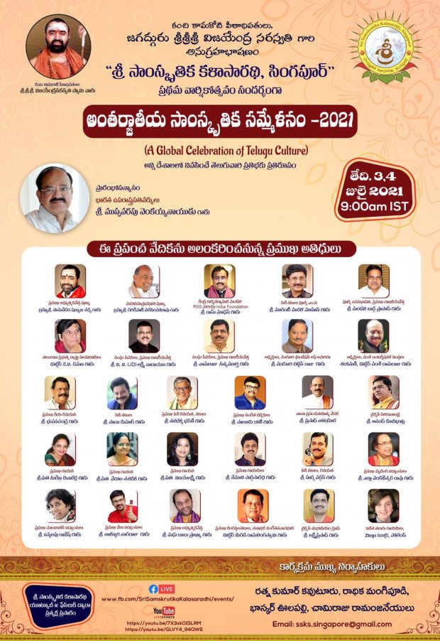 'శ్రీ సాంస్కృతిక కళాసారథి' సింగపూర్ సంస్థ 2020 జూలై లో ప్రారంభమై, నేటి వరకు సాహిత్య, సంగీత, సాంస్కృతిక, ఆధ్యాత్మిక, నాటక రంగాల్లో, సుమారు 24 కార్యక్రమాలను విజయవంతంగా నిర్వహించి, ప్రథమ వార్షికోత్సవ వేడుకలు జరుపుకుంటున్న సందర్భంగా, 2021 జూలై 3,4 తారీకులలో "అంతర్జాతీయ సాంస్కృతిక సమ్మేళనం 2021" అనే బృహత్యజ్ఞానికి శ్రీకారం చుట్టింది.