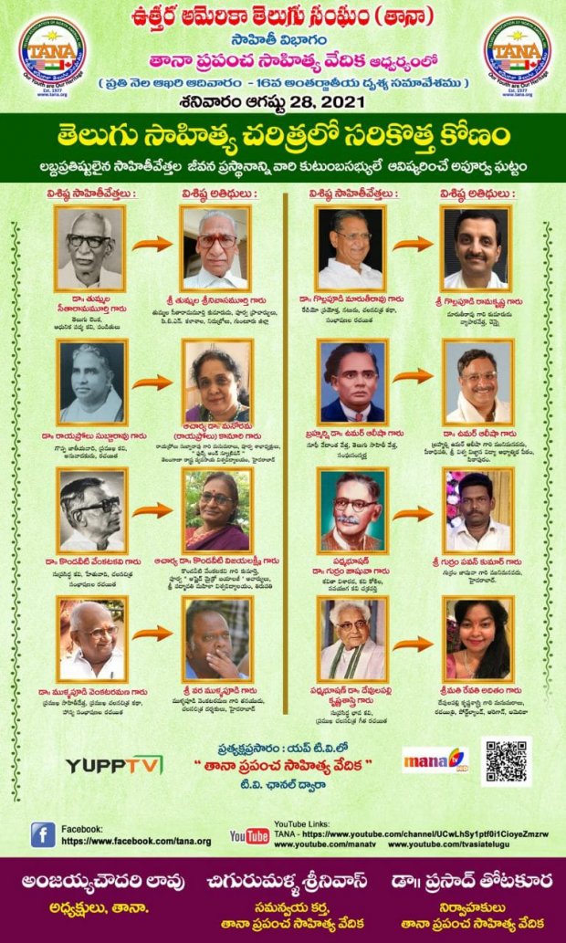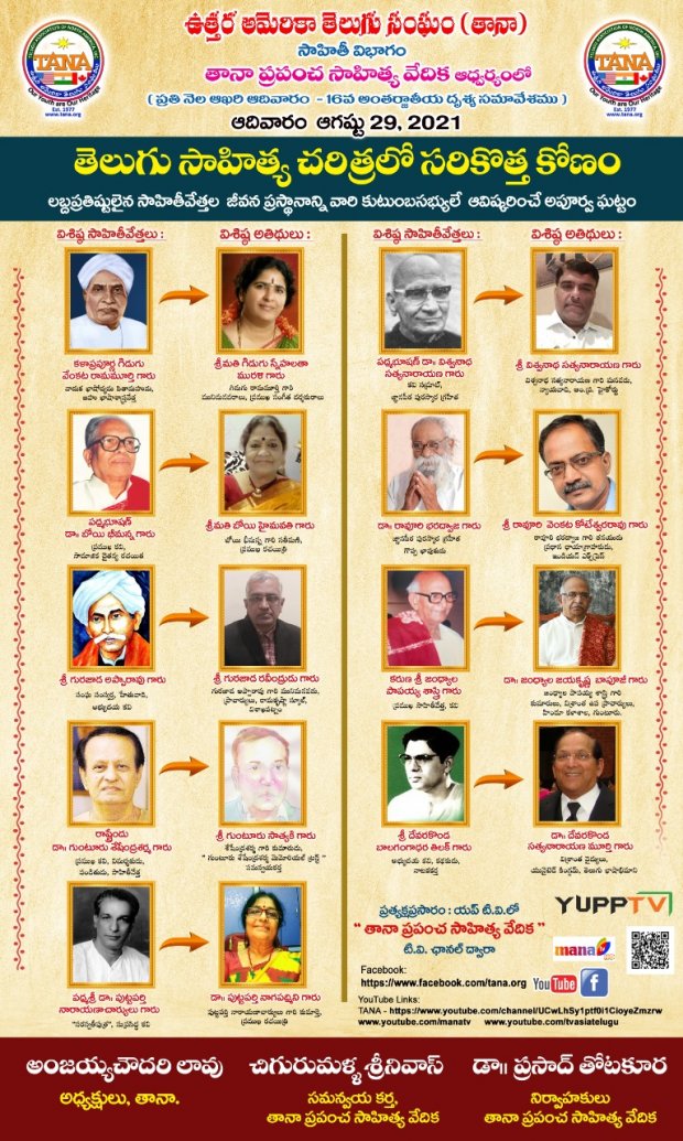 తానా ప్రపంచ సాహిత్య వేదిక నిర్వాహకులు డా.ప్రసాద్ తోటకూర మాట్లాడుతూ ఎంతోమంది లబ్ధప్రతిష్టులైన సాహితీవేత్తల జీవిత ప్రస్థానాలను ఈ సభలో వారి కుటుంబసభ్యులే ఆవిష్కరించడం సాహితీ చరిత్రలో ఒక అపూర్వ ఘట్టమని,శనివారం నాడు-డా.తుమ్మల సీతారామమూర్తి చౌదరి,డా.రాయప్రోలు సుబ్బారావు, డా.కొండవీటి వేంకట కవి, డా.ముళ్ళపూడి వెంకటరమణ,డా.గొల్లపూడి మారుతీరావు,బ్రహ్మర్షి డా.ఉమర్ ఆలీషా, పద్మభూషణ్ డా.గుర్రం జాషువా, పద్మభూషణ్ డా.దేవులపల్లి కృష్ణశాస్త్రి కుటుంబసభ్యులు మరియు ఆదివారం నాడు కళాప్రపూర్ణ గిడుగు వెంకట రామమూర్తి, పద్మభూషణ్ డా.బోయి భీమన్న, గురజాడ అప్పారావు, రాష్ట్రేందు డా.గుంటూరు శేషేంద్రశర్మ, పద్మశ్రీ డా.పుట్టపర్తి నారాయణాచార్యులు, పద్మభూషణ్ డా.విశ్వనాథ సత్యనారాయణ, డా.రావూరి భరద్వాజ, కరుణశ్రీ జంధ్యాల పాపయ్యశాస్త్రి, దేవరకొండ బాలగంగాధర తిలక్ కుటుంబసభ్యులు పాల్గొని ఎన్నో అసక్తికరమైన విషయాలను పంచుకోనున్నారని అందరికీ ఆహ్వానం పలికారు.