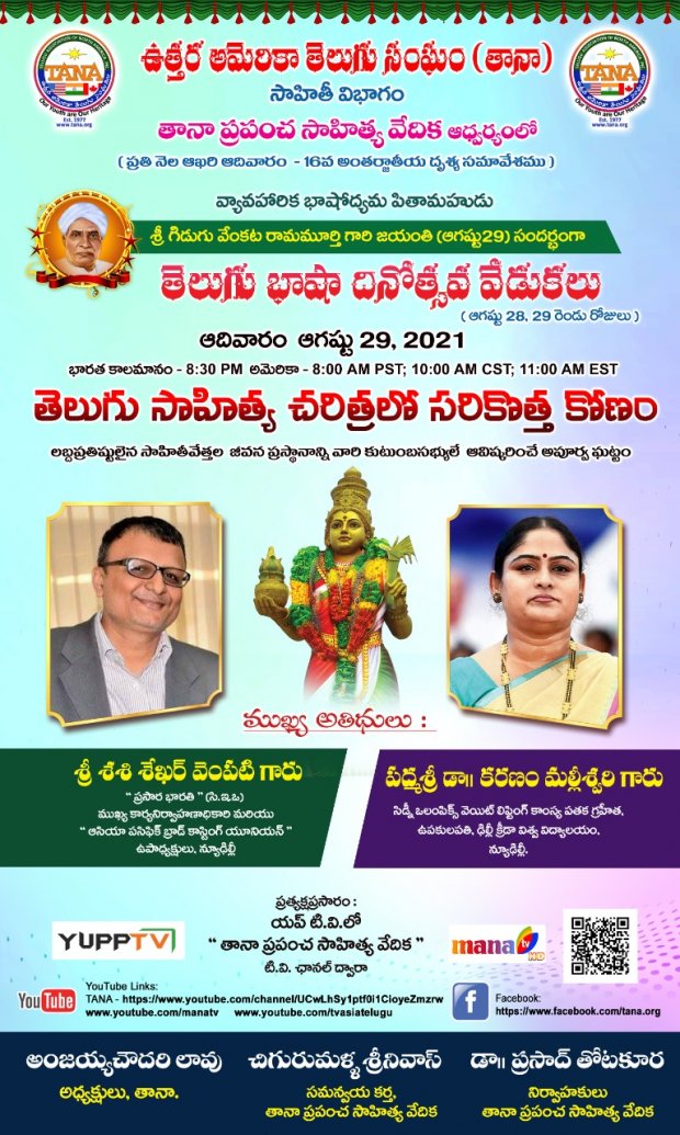 ఉత్తర అమెరికా తెలుగు సంఘం (తానా) సాహితీ విభాగం తానా ప్రపంచ సాహిత్య వేదిక ఆధ్వర్యంలో వ్యావహారిక భాషోద్యమ పితామహుడు శ్రీ గిడుగు వేంకట రామమూర్తిగారి జయంతి (ఆగష్టు 29) సందర్భంగా అంతర్జాతీయ స్థాయిలో అంతర్జాల దృశ్య సమావేశంలో “తెలుగు భాషా దినోత్సవ వేడుకలు” శనివారం, ఆదివారంఆగష్టు 28, 29 రెండు రోజులపాటు ఘనంగా జరుగనున్నాయని తానా అధ్యక్షుడు అంజయ్య చౌదరి లావు ప్రకటించారు.