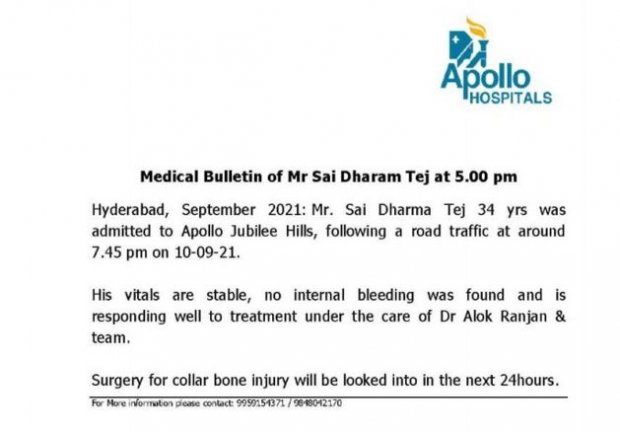 అయితే తాజాగా, సాయి తేజ్ హెల్త్ బులిటెన్ను అపోలో ఆసుపత్రి వర్గాలు విడుదల చేశాయి. సాయి ధరమ్ తేజ్ ఆరోగ్యం నిలకడగానే ఉందని అన్నారు. అంతర్గత గాయాలు ఏమి లేవని డాక్టర్లు స్పష్టం చేశారు. ప్రధాన అవయవాలు బాగానే పని చేస్తున్నాయని అపోలో వైద్యులు బులిటెన్లో పేర్కొన్నారు. అటు ఇంటర్నల్ బ్లీడింగ్ లాంటిది ఏమిలేదన్న వైద్యులు.. చికిత్సకు సాయి ధరమ్ తేజ్ స్పందిస్తున్నారని తెలిపారు. కాలర్ బోన్ ఫ్యాక్చర్ సంబంధించి 24 గంటల్లో నిర్ణయం తీసుకుంటామని అపోలో వైద్యులు అన్నారు. డాక్టర్ అలోక్ రంజన్ పర్యవేక్షణలో సాయి ధరమ్ తేజ్కు చికిత్స నిర్వహిస్తామని పేర్కొన్నారు.