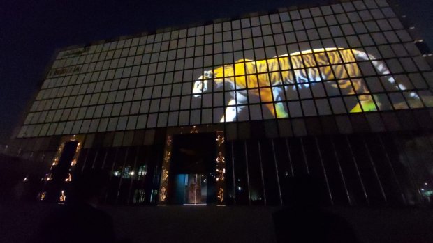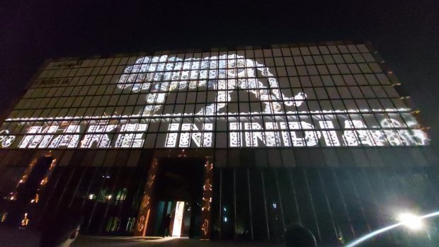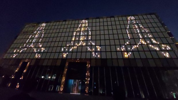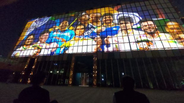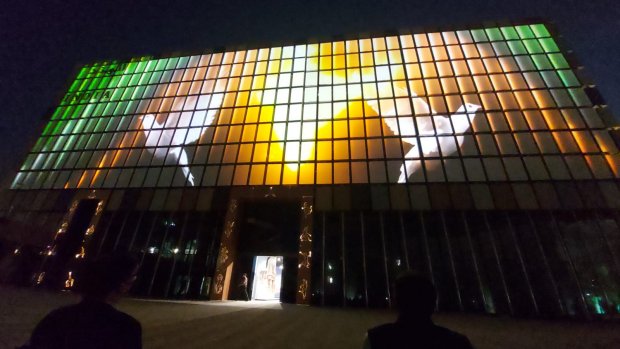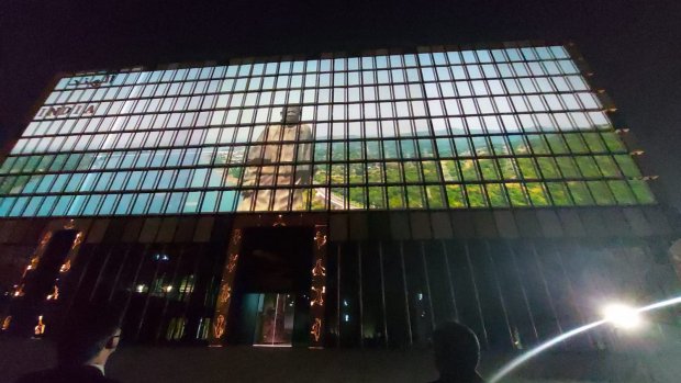ప్రాచీన మరియు ఆధునిక కలయికను సూచించే కంప్యూటర్-నియంత్రిత కదలిక సామర్థ్యం కలిగిన 600 వ్యక్తిగత గతి ప్యానెల్లతో కూడిన డైనమిక్ ముఖభాగాన్ని కలిగి ఉంటుంది ఈ భవనం. ప్రతి ప్యానెల్ వ్యక్తిగతంగా తిరగవచ్చు, మొత్తం వరుసతో లేదా మొత్తం గోడతో సమకాలీకరించవచ్చు. కదిలే బ్లాక్స్ ప్రాతినిధ్యం వహిస్తాయి మరియు 'ఇండియా ఆన్ మూవ్' గా పిలువబడే ఈ బ్లాక్స్ పై 26 వారాలలో 75 కథలను ప్రదర్శించనున్నారు. భారతీయ సంస్కృతి, వారసత్వం, సంప్రదాయం తో కూడిన ఈ షో చూపరులకు చక్కని అనుభూతి కలిగిస్తుంది.