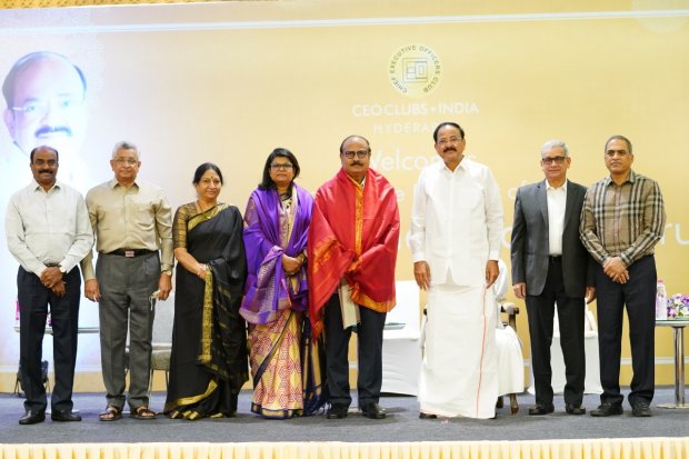 సీఈవో క్లబ్స్ ఇండియా, హైదరాబాద్ చాప్టర్ ఆధ్వర్యంలో శనివారం హైదరాబాద్ లో ఏర్పాటుచేసిన సదస్సుకు ఉపరాష్ట్రపతి విచ్చేశారు. ఈ సందర్భంగా ఆయన మాట్లాడుతూ, భారతదేశాన్ని అన్నిరంగాల్లో ముందుకు తీసుకెళ్లేందుకు ప్రభుత్వాలు, పరిశ్రమలు, విద్యాసంస్థల మధ్య పరస్పర సమన్వయం అవసరమని సూచించారు. డిజిటల్ సేవలు, తయారీ రంగం వంటి ఎన్నో రంగాల్లో మనదేశం వద్ద అపారమైన శక్తిసామర్థ్యాలున్నాయని కావాల్సిందల్లా వాటిని గుర్తించి, ప్రోత్సహించి సద్వినియోగపరుచుకోవడమేనని ఆయన అన్నారు.