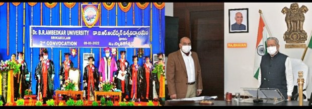 విజయవాడ: రాష్ట్ర ప్రభుత్వం ఉన్నత విద్యా రంగంలో నాణ్యతకు అత్యధిక ప్రాధాన్యత ఇస్తూ గణనీయమైన వృద్దిని నమోదు చేస్తుందని ఆంధ్రప్రదేశ్ గవర్నర్ బిశ్వభూషణ్ హరిచందన్ అన్నారు. కులపతి హోదాలో రాష్ట్ర గవర్నర్ బుధవారం శ్రీకాకుళంలోని డాక్టర్ బి.ఆర్. అంబేద్కర్ విశ్వవిద్యాలయం రెండో స్నాతకోత్సవంలో పాల్గొన్నారు. విజయవాడ రాజ్ భవన్ నుండి బుధవారం ఆన్ లైన్ విధానంలో ప్రసంగించిన గవర్నర్ కోవిడ్ కారణంగా తరగతి గది అభ్యాసం నుండి ఆన్లైన్ ప్లాట్ఫారమ్లు, డిజిటల్ టెక్నాలజీలను ప్రత్యామ్నాయ వ్యవస్థగా స్వీకరించవలసిన పరిస్ధితి తలెత్తిందన్నారు. సమాజంలోని అన్ని రంగాలపై కోవిడ్ మహమ్మారి ప్రభావం చూపిందన్నారు. జాతీయ విద్యా విధానం 2020 విద్యా వ్యవస్ధలో సమూల మార్పులకు శ్రీకారం చుట్టిందని బోధనా విధానంలో సంస్కరణలకు పెద్దపీట వేస్తుందని తెలిపారు. ఈ క్రమంలో మార్పును స్వాగతిస్తూ రాష్ట్ర ప్రభుత్వం ముందంజలో ఉండటం అభినందనీయమన్నారు.