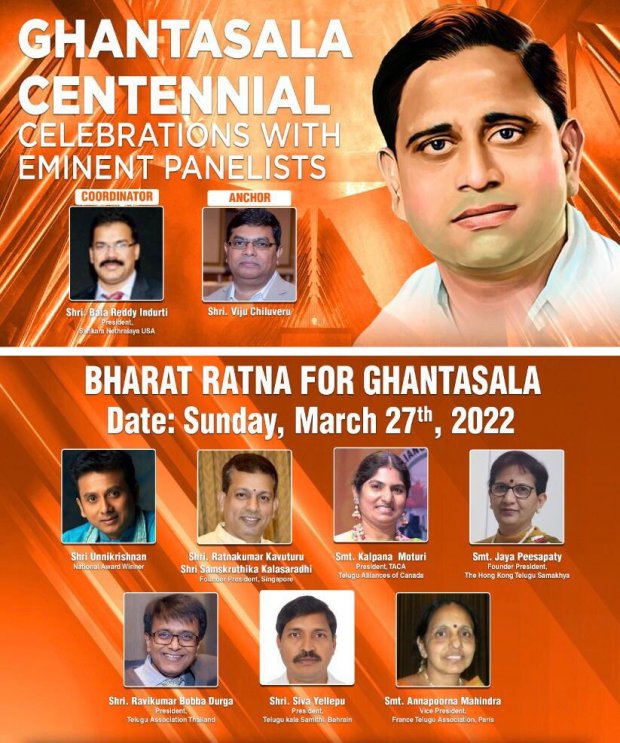 స్వాతంత్ర సమరయోధుడు పద్మశ్రీ ఘంటసాల వెంకటేశ్వర రావు శత జయంతి వేడుకల సందర్భముగా వారికి భారతరత్న పురస్కారం ఇవ్వడం సముచితం అనే నినాదంతో అమెరికా నుండి శంకర నేత్రాలయ యు.యెస్.ఏ. అధ్యక్షులు బాల ఇందుర్తి ఆధ్వర్యంలో ఇప్పటివరకు 40 పైగా టీవీ కార్యక్రమాలను నిర్వహించి ప్రపంచం నలుమూలలో ఉన్న తెలుగు సంస్థలను ఏకాతాటిపై తీసుకువస్తున్నట్లు నిర్వాహుకులు తెలిపారు. అందులో బాగంగా యు.యెస్.ఏ నుంచి విజ్జు చిలువేరు వ్యాఖ్యాత గా 27 మార్చి 2022 నాడు జరిగిన అంతర్జాల (జూం) కార్యక్రమములో జాతీయ అవార్డు గ్రహీత ఉన్నికృష్ణన్ ముఖ్యఅతిథి గా పాల్గొని ఘంటసాల పాటలోని మాధుర్యం మరియు దేశభక్తిని కొనియాడారు, వాగ్గేయకారుడు అన్నమయ్య తరువాత కలియుగదైవం ఐన వెంకటేశ్వర స్వామి సన్నిధిలో పాడే అరుదైన అవకాశాన్ని ఘంటసాల పొందారు అని కీర్తించారు. ఈ సందర్భంగా ఘంటసాల కి భారతరత్న కోసం మీరందరు చేస్తున్న కృషిని అభినందించి తన పూర్తి సంఘీభావాన్ని ప్రకటించారు. బాల ఇందుర్తి మాట్లాడుతూ ఇప్పటివరకు 48 మంది భారతరత్న అవార్డు కి ఎంపిక అవ్వగా, అందులో ఒక్క తెలుగు వారికి కూడా దక్కకపోవడం బాధాకరమైన విషయం అని అన్నారు. అతి త్వరలోనే సంతకాల సేకరణ చేపడుతున్నట్లు తెలిపారు.