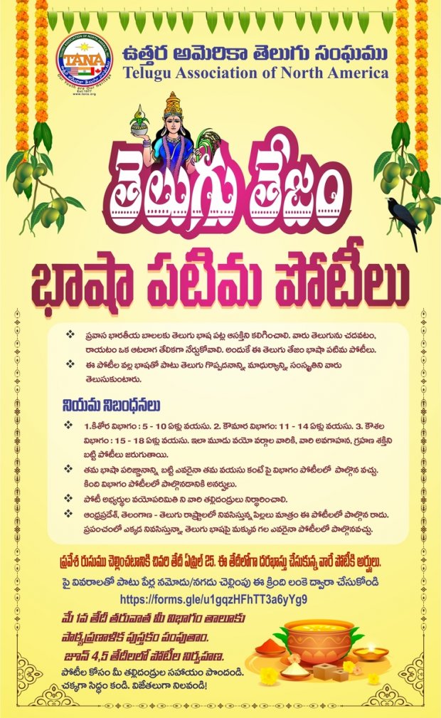 అమెరికా: తెలుగు భాషా సాహిత్యం, పరివ్యాప్తి కోసం ఉత్తర అమెరికా తెలుగు సంఘం (తానా) ఇప్పటికే పలు కార్యక్రమాలు నిర్వహించింది. వివిధ దేశాల్లో నివసిస్తున్న ప్రవాస పిల్లలు, యువకులకు తెలుగు భాషపై మక్కువ, పటిష్ఠత, అభిరుచి పెంచడం కోసం తాజాగా ‘తానా - తెలుగు పరివ్యాప్తి కమిటీ’ ఆధ్వర్యంలో ‘తెలుగు తేజం పోటీలు’ నిర్వహిస్తోంది. ఈ పోటీల్లో ఆంధ్రప్రదేశ్, తెలంగాణ రాష్ట్రాల్లో నివసిస్తున్న పిల్లలు మినహా ప్రవాస దేశాలలో నివసిస్తున్న వారు ఎవరైనా పాల్గొనవచ్చు. ఈ సందర్భంగా నిర్వాహకులు తల్లితండ్రులకు వారి పిల్లలను ప్రోత్సహించి ఈ పోటీలలో భాగస్వాములు చేయవలసిందిగా కోరారు. దరఖాస్తు, ప్రవేశ రుసుము, నియమ నిబంధనలు కోసం https://forms.gle/ u1gqzHFhTT3a6yYg9 లింక్ ద్వారా చూడవచ్చు. దరఖాస్తు, ప్రవేశ రుసుము చెల్లించడానికి ఆఖరు తేది: ఏప్రిల్ 25, 2022. జూన్ 4,5 తేదీలలో జూమ్ ద్వారా పోటీల నిర్వహణ ఉంటుంది.