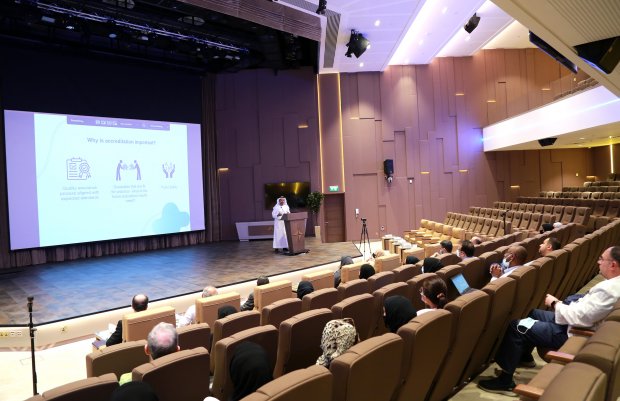 The workshop aims to identify the accreditation criteria of National Institute for Health Specialties (Emirati Board) and to prepare for the accreditation of Dubai Health Authority facilities. He also presented the importance of the accreditation and evaluation stages until the issuance of Emirati Board certificates.