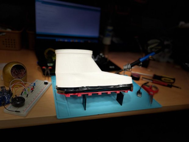 Dr. Jose and his team which includes undergrad student Mariam Alkuwaiti - have previously worked on haptic feedback devices installed inside the boots where it can record information of the ground, but they have been testing out simple microphone set ups in the boots for a more sustainable, lighter, cheaper option.