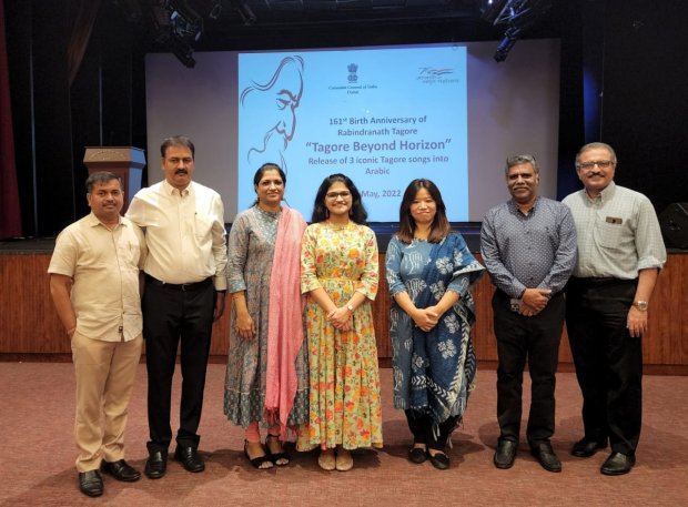 దుబాయ్: రవీంద్రనాథ్ ఠాగూర్ 161వ జయంతిని దుబాయ్లోని ఇండియన్ కాన్సులేట్లో ఘనంగా జరుపుకున్నారు. ఈ సందర్భంగా 'ఠాగూర్ బియాండ్ హారిజోన్' అనే ఆల్బమ్లోని 3 ఐకానిక్ పాటలను విడుదల చేశారు. ఠాగూర్ రాసిన మూడు పాటలను అరబిక్లోకి అనువదించి అందించడం ఇదే తొలిసారి. ప్రముఖ ఎమిరాతి కవి డాక్టర్ షిహాబ్ ఘనేమ్ వీటిని అనువాదం చేశారు.దేవ్ చక్రవర్తి పాటలకు స్వరాలను అందించారు.గిన్నిస్ వరల్డ్ రికార్డ్స్ హోల్డర్ సుచేత సతీష్ అరబిక్ లో గానం చేశారు. భారత కాన్సులేట్ ఆడిటోరియంలో జరిగిన ఈ కార్యక్రమంలో కాన్సుల్ జనరల్ ఆఫ్ ఇండియా అమన్ పూరి ఈ పాటలను విడుదల చేశారు. కాన్సుల్ ఫర్ కల్చర్ తాడు మాము ఈ కార్యక్రమానికి అధ్యక్షత వహించారు. డాక్టర్ ఘనేమ్, దేవ్, సుచేత త్రయం ఇప్పటికే ఠాగూర్ పాటలను అరబిక్లోకి అనువదించే ప్రాజెక్టుపై పని చేస్తున్నారు.ఈ కార్యక్రమంలో యూఏఈ, ఇండియా నుండి ప్రముఖ వ్యక్తులు మరియు ఇండియన్ పీపుల్స్ ఫోరంకు సంబంధించిన ప్రదీప్ మురళి,సుమీత, కుంభాల మహేందర్ రెడ్డి, శివ కుమార్ మరియు ఇండియన్ కౌన్సిల్ కు సంబంధించిన అధికారులు పాల్గొన్నారు.