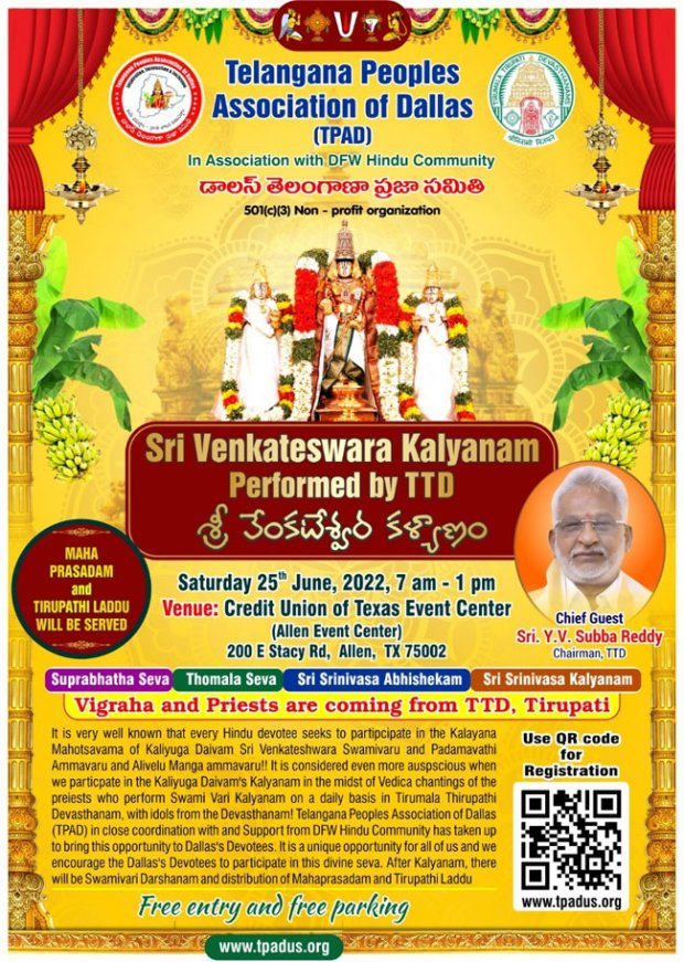జూన్ 25వ తేదీన అలెన్ ఈవెంట్ సెంటర్ (క్రెడిట్ యూనియన్ ఆఫ్ టెక్సాస్ ఈవెంట్ సెంటర్) వేదికగా డాలస్ తెలంగాణ ప్రజాసమితి (TPAD) చేపడుతున్న ఈ విశేష కార్యక్రమానికి టీటీడీ చైర్మన్ వైవీ సుబ్బారెడ్డి పాల్గొననున్నారు. స్వయంగా దేవదేవతల ప్రతిరూపాలను, పూజారులను ఆయన వెంటబెట్టుకుని రానున్నారు. ఈ సందర్భంగా డాలస్లో ఉంటున్న తెలంగాణ, తెలుగు వారి సౌకర్యార్థం టీపాడ్ తగిన ఏర్పాట్లను చేస్తోంది.