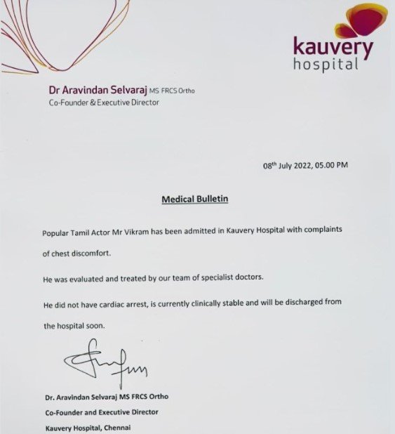 చియాన్ విక్రమ్కు ఛాతీలో తేలికపాటి అసౌకర్యంగా ఉండటంతో ఆయన్ను కావేరీ ఆసుపత్రికి తీసుకొచ్చినట్లుగా ఆయన వెల్లడించారు. అయితే ఈలోపే మీడియాలో విక్రమ్కు గుండెనొప్పి వచ్చిందని వార్తలు రావడం చూసి తాను షాక్ అయ్యానని.. అందుకే ఇలాంటి వార్తలను నమ్మవద్దంటూ విక్రమ్ అభిమానులకు తెలిపారు. కాగా, తాజాగా కొద్దిక్షణాల ముందే కావేరీ ఆసుపత్రి విక్రమ్ హెల్త్ బులెటిన్ను రిలీజ్ చేసింది. విక్రమ్కు ఛాతిలో నొప్పిరావడంతో ఆయన ఆసుపత్రిలో జాయన్ అయ్యాడని.. నిపుణులైన డాక్టర్లతో ఆయనకు వైద్యం అందించామని.. ఆయనకు ఎలాంటి గుండెపోటు రాలేదని.. ప్రస్తుతం విక్రమ్ ఆరోగ్యం నిలకడగా ఉందని.. త్వరలోనే ఆయన్ను డిశ్చార్జ్ చేస్తామని కావేరీ ఆసుపత్రి యాజమాన్యం వెల్లడించింది.