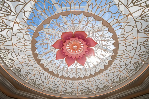 The Hindu Temple Dubai stands as a monument of inner peace and a refuge where devotees can seek solace in divinity. The Hindu Temple is a beautiful marriage of two cultures. The showstopping piece is undoubtedly the duality of the traditional Hindu dome atop the Mashrabiya screens infused with the 3D-printed lotus symbol. The transparent dome extends to the sky while the Arabian architecture-inspired screens cast calming shadows through the room.