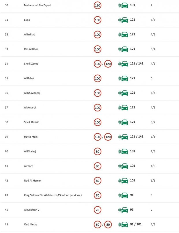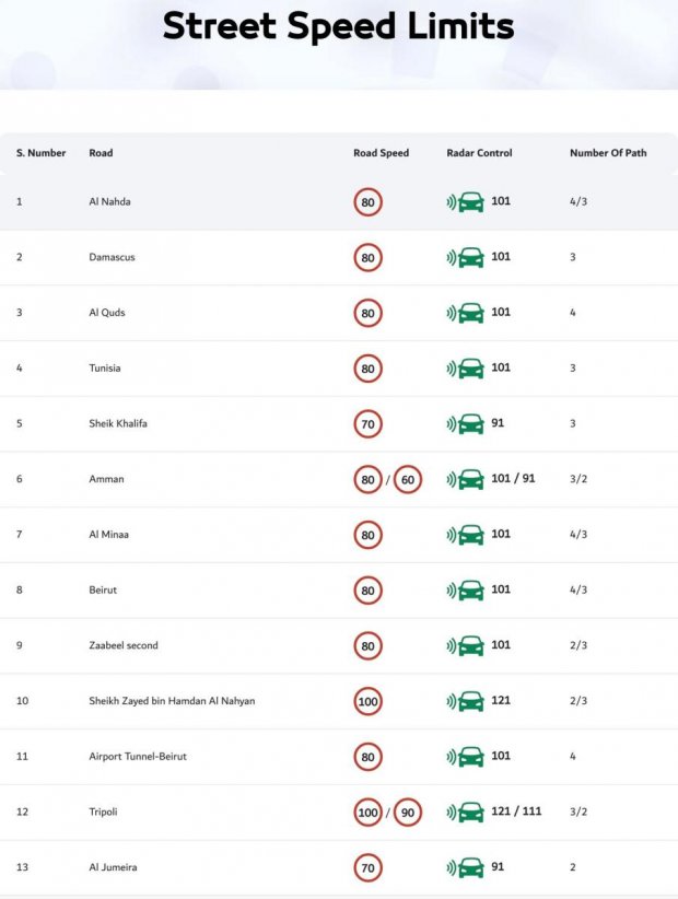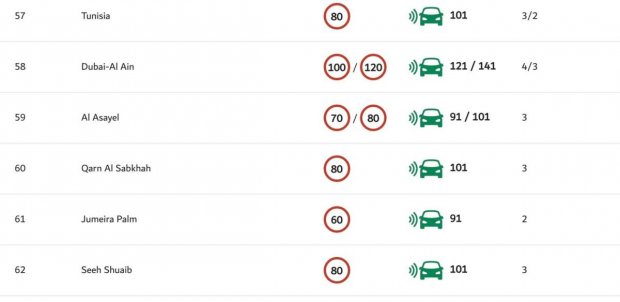 దుబాయ్ పోలీసులు తమ వెబ్సైట్లో వివిధ రహదారులపై వేగ పరిమితులను పొందుపరిచారు. జనవరి 13న చేసిన అప్డేట్ ప్రకారం.. పరిమితులు గంటకు 60 నుండి 120కిమీల వరకు ఉన్నాయి. మొహమ్మద్ బిన్ జాయెద్, ఎమిరేట్స్ రోడ్లలో వేగ పరిమితి గంటకు 110కిమీగా ఉండగా.. అనేక అంతర్గత రోడ్లలో ఇది గంటకు 70కిమీగా నిర్ణయించారు. దుబాయ్-హట్టా రోడ్లో కొంత భాగం వేగ పరిమితిని 100kmph నుండి 80kmph కు తగ్గించినట్లు , ఎమిరేట్స్ రోడ్స్ అండ్ ట్రాన్స్పోర్ట్ అథారిటీ (RTA) ప్రకటించింది. ఈ మార్పు దుబాయ్, అజ్మాన్, అల్ హోస్న్ రౌండ్అబౌట్ మధ్య విస్తరించి ఉన్న సెక్టార్ను కవర్ చేస్తుందన్నారు.