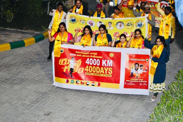 రియాద్: టీడీపీ జాతీయ ప్రధాన కార్యదర్శి నారా లోకేశ్ 'యువగళం' పాదయాత్రకి మద్దుతుగా జనవరి 27 శుక్రవారం న యన్.ఆర్.ఐ టిడిపి సౌదీ అరేబియా కార్యవర్గం ఆధ్వర్యంలో ఖొబర్ , సౌదీ అరేబియా లో తెలుగు మహిళలతో కలిసి వందలాది ఎన్నారై టీడీపీ కార్యకర్తలు, అభిమాను లు పాద యాత్ర చేసి లోకేష్ పాదయాత్ర కు సంఘీభావం తెలియజేసారు.