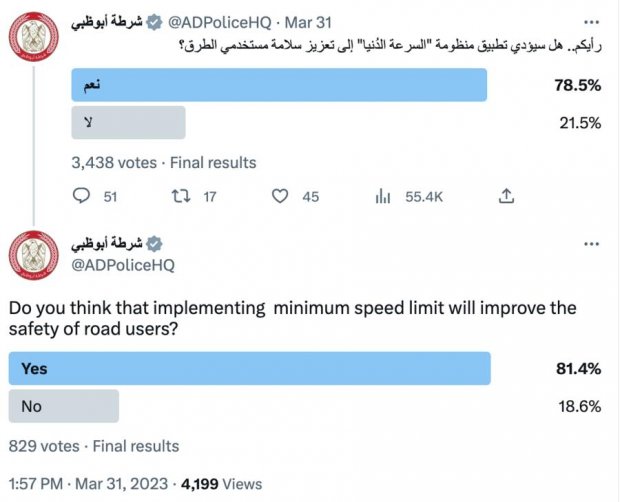 అబుధాబి: కీలకమైన వేగవంతమైన రహదారి లేన్లలో కనీస వేగాన్ని అమలు చేయడానికి అబుధాబి పోలీసుల చర్యకు అధిక సంఖ్యలో నివాసితులు మద్దతు ఇచ్చారు. సోషల్ మీడియాలో ఫోర్స్ నిర్వహించిన పోల్ ప్రకారం.. 78 శాతం మంది ఈ చర్యకు అనుకూలంగా ఓటు వేశారని పోలీసులు తెలిపారు. ట్విట్టర్లో 81 శాతం మంది వినియోగదారులు ఈ నిర్ణయానికి మద్దతు ఇచ్చారని పేర్కొన్నారు. షేక్ మహ్మద్ బిన్ రషీద్ రోడ్డులో 140కిలోమీటర్లు, రెండు ఎడమవైపు లేన్లపై కనిష్ఠంగా 120కిమీ వేగాన్ని అమలు చేస్తామని పోలీసులు గత నెలలో ప్రకటించారు. మే 1 నుండి రెండు లేన్లలో స్పీడ్ పరిమితి నిబంధన ఉల్లంఘించిన వారికి 400 దిర్హామ్ల జరిమానా విధించడం ప్రారంభించారు. రోడ్డు భద్రతను పెంపొందించడమే కనీస వేగ పరిమితి లక్ష్యంగా పోలీసులు ఈ సందర్భంగా వివరించారు. రహదారి గరిష్ఠ వేగ పరిమితి 140kmph కలిగి ఉన్నందున, ఫాస్ట్ లేన్లలో కనిష్ఠంగా 120kmph వేగాన్ని అమలు చేయడం వలన ఈ ట్రాక్లపై ఉన్న అన్ని వాహనాలు 20kmph మార్జిన్లో నడుస్తాయని తెలిపారు. ప్రమాదాలు జరిగితే వాటి తీవ్రతను తగ్గించేందుకు ఇది దోహదపడుతుందన్నారు.