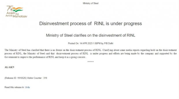 ‘‘రాష్ట్రీయ ఇస్పాత్ నిగమ్ లిమిటెడ్ (RINL) డిజిన్వెస్ట్మెంట్ ప్రక్రియ ఆగిపోలేదు. ఈ ప్రక్రియ పురోగతిలో ఉంది. మరింత మెరుగుపరచడానికి ప్రయత్నాలు జరుగుతున్నాయి’’ అని ప్రకటనలో తెలిపింది. ఆర్ఐఎన్ఎల్ పెట్టుబడుల ఉపసంహరణ ప్రక్రియ నిలిచిపోయినట్లు వచ్చిన కొన్ని మీడియా రిపోర్టుల్లో నిజం లేదని చెప్పింది.
