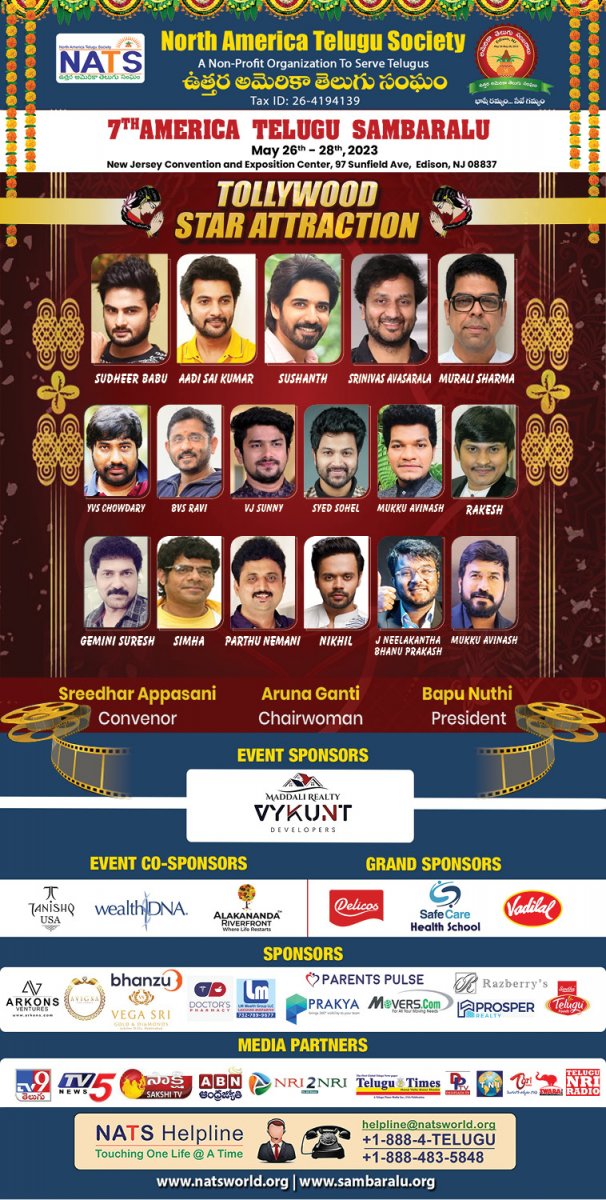 అమెరికా: అమెరికాలో ప్రతి రెండేళ్లకు ఒక్కసారి అంగరంగ వైభవంగా జరిపే అమెరికా తెలుగు సంబరాలకు ఉత్తర అమెరికా తెలుగు సంఘం నాట్స్ సర్వ సన్నద్ధమైంది. ఈ సారి న్యూజెర్సీ వేదికగా ఈ నెల 26 నుంచి 28 వరకు జరిగే ఈ తెలుగు సంబరాలను అద్భుతంగా జరిపేందుకు సంబరాల కమిటీ సన్నాహాలు ముమ్మరం చేసింది. ఇప్పటికే తెలుగు సంబరాలకు వచ్చే తెలుగు అతిరథ మహరధుల జాబితాను విడుదల చేసింది. తాజాగా నాట్స్ తెలుగు సంబరాల్లో నిర్వహించే ముఖ్య కార్యక్రమాలను ప్రకటించింది. తెలుగు సంస్కృతి, సంప్రదాయలే ప్రధాన ఎజెండా రూపొందించిన తెలుగమ్మాయి కార్యక్రమం తుది పోటీలు సంబరాల వేదికపై జరగనున్నాయని నాట్స్ సంబరాల కమిటీ తెలిపింది. తెలుగు సినీ అతిరథ మహారథులైన ఘంటసాల, ఎన్టీఆర్, అల్లు రామలింగయ్య శతజయంతి ఉత్సవాలను నాట్స్ సంబరాల వేదికపై నిర్వహించనున్నట్టు నాట్స్ అమెరికా తెలుగు సంబరాల కమిటీ ఛైర్మన్ శ్రీధర్ అప్పసాని తెలిపారు.. సంబరాలకు ముఖ్య అతిథులుగా ప్రముఖ నిర్మాతలు అల్లు అరవింద్, ఆదిశేషగిరిరావు, ప్రముఖ పారిశ్రామిక వేత్తలు కె.వి.రావు, రెయిన్ బో హాస్పిటల్స్ ఛైర్మన్ రమేశ్ కంచర్ల, ప్రముఖ వ్యాపారవేత్త కిషోర్ కొత్తపల్లి విచ్చేయనున్నారని నాట్స్ అమెరికా తెలుగు సంబరాల కో కన్వీనర్ రాజ్ అల్లాడ తెలిపారు. సంబరాల్లో తెలుగు సాంస్కృతిక, జానపద కార్యక్రమాలు, సినీ సంగీత విభావరిలు, డ్యాన్స్ షోలు, సినీ కళాకారులతో మీట్ అండ్ గ్రీట్ కార్యక్రమాలు ఉండనున్నాయి. వీటితో పాటు విద్య, వ్యాపార, మహిళా సదస్సులు నిర్వహించనున్నట్టు నాట్స్ తెలిపింది. సంబరాలకు గౌరవ అతిధులుగా సినీ ప్రముఖులు సాయికుమార్, కోదండరామిరెడ్డి. బి.గోపాల్, ఆలీ, చంద్రబోస్ తదితరులు విచ్చేయనున్నారు. సినీ సంగీత ప్రవాహంతో తెలుగు వారిని అలరించేందుకు ఎలిజియం బ్యాండ్, మణిశర్మ, థమన్, శివమణి, గీతామాధురి, శ్రీ కృష్ణ, పార్ధు నేమాని, సింహా తరలి రానున్నారు. సినీ రచన పై అవగాహన కలిగించేందుకు సంబరాల్లో నిర్వహించే వర్క్ షాప్కు ప్రముఖ దర్శకులు బీవీఎస్ రవి ప్రత్యేకంగా హాజరుకానున్నారు. ఇంకా సినీ దర్శకులు గోపిచంద్ మలినేని, అవసరాల శ్రీనివాస్, యువ హీరోలు ఆది సాయికుమార్, సుధీర్ బాబు, సుశాంత్, డాన్స్ మాస్టర్ సత్య, హిరోయిన్లు సంయుక్త మీనన్, హెబ్బా పటేల్, నేహాశెట్టి, మన్ర చోప్రా, రుహాని శర్మ సంబరాల్లో సందడి చేయనున్నారని సంబరాల డిప్యూటీ కన్వీనర్ రాజ్ అల్లాడ తెలిపారు. బిగ్ బాస్ విన్నర్స్ సన్నీ, బిగ్ బాస్4 ఆర్టిస్టులు సోహైల్, హిమజ, శివజ్యోతి, జోర్ధార్ సుజాత, జబర్థస్త్ రాకేశ్, ముక్కు అవినాశ్, టీవీ ఆర్టిస్టులు ప్రియ, సోనియా చౌదరి, సాహిత్య, రజిత, జయలక్ష్మి, ప్రవీణ కడియాల, ప్రముఖ నటి మంజుభార్గవి, ప్రముఖ నటులు కృష్ణంరాజు సతీమణి శ్యామలా దేవి, నందమూరి సుహాసిని