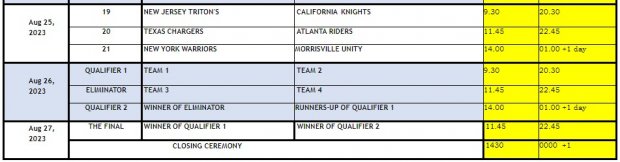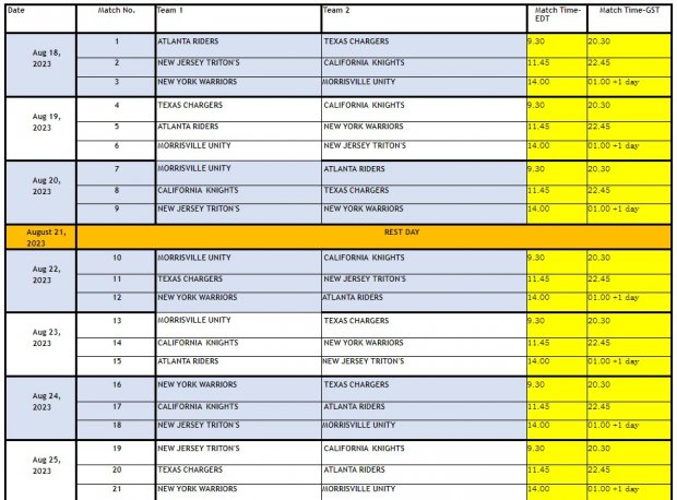 A total of six teams - Atlanta Fire, California Knights, Morrisville Unity, New Jersey Tritons, New York Warriors and Texas Chargers - are all set to mesmerise cricket fans in the United States during the power-packed tournament from August 18-27. The competition will consist of 21 round-robin games ahead of the play-offs and the final. A celebrity game will also be held on the day of the Finale.