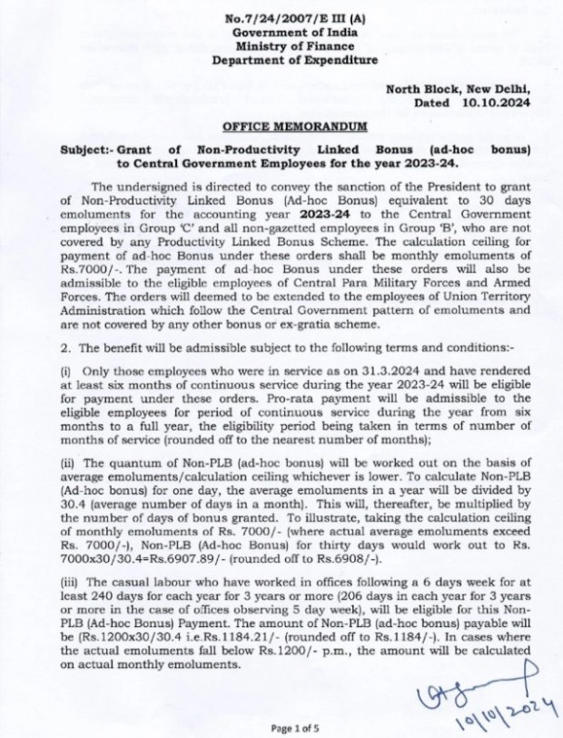 అమరావతి: కేంద్ర ప్రభుత్వ ఉద్యోగులకు 2023-24 సంవత్సరానికి నెల రోజులు బోనస్ ప్రకటిస్తూ కేంద్ర ప్రభుత్వం గురువారం ఉత్తర్వులు జారీ చేసింది.గ్రూప్ సి ఉద్యోగులు, గ్రూప్ బి లోని నాన్ గజిటెడ్ ఉద్యోగులకు ఈ బోనస్ వర్తిస్తుంది.గత ఆర్థిక సంవత్సరంలో కంటిన్యూగా కనీసం ఆరు నెలలు ఉద్యోగం చేస్తే బోనస్ తీసుకోవటానికి అర్హులుగా ఆ ఉత్తర్వుల్లో కేంద్రం ప్రకటించింది.