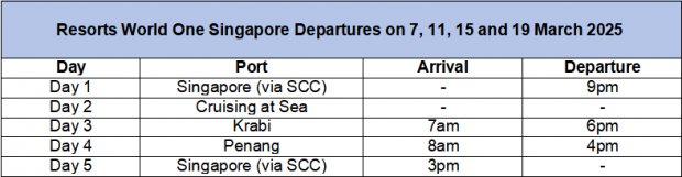 Singapore: Resorts World Cruises today announces that the Resorts World One cruise ship will homeport in Singapore for a limited season, offering four roundtrip 5 Day / 4 Night Cruises to two renowned destinations, including to Krabi in Thailand and Penang in Malaysia. The cruises will depart from the Singapore Cruise Centre (SCC) on 7, 11, 15 and 19 March 2025, coinciding with the Singapore school holidays.
