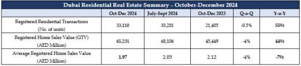 The registered home sales value (GTV) for the quarter reached AED 65.23 billion, marking a 44% Y-o-Y increase over the AED 45.45 billion reported in October–December 2023. Average registered home sales value also adjusted slightly, coming in at AED 1.97 million, dropping marginally by 7%.