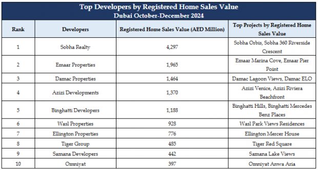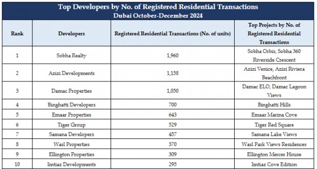 In the December quarter of 2024, Sobha Realty led the market with 1,960 registered residential transactions, driven largely by its flagship project, Sobha Orbis. Azizi Developments followed with 1,158 transactions, with Azizi Venice being a standout performer. Damac Properties ranked third with 1,050 transactions, bolstered by its Damac ELO project. Binghatti Developers came in fourth, recording 700 transactions, with Binghatti Hills as its flagship development.