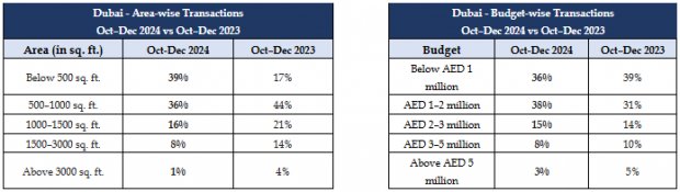 The Dubai residential real estate market saw units below 1,000 sq. ft. dominating 75% of transactions in the December quarter of 2024, up from 61% in the same period of 2023. In comparison, units with an area greater than 1,000 sq. ft. declined to 25% in October-December 2024 from 39% in the same period the previous year.
