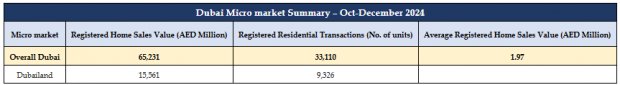 In terms of registered home sales value, Dubai recorded AED 65,231 million during the quarter. Dubailand contributed 24% of the total sales value. The Palm Jumeirah secured the second position, accounting for 14%, while Jumeirah followed closely with a 13% market share. These three micro-markets together represented 51% of Dubai’s total registered home sales value for the quarter.